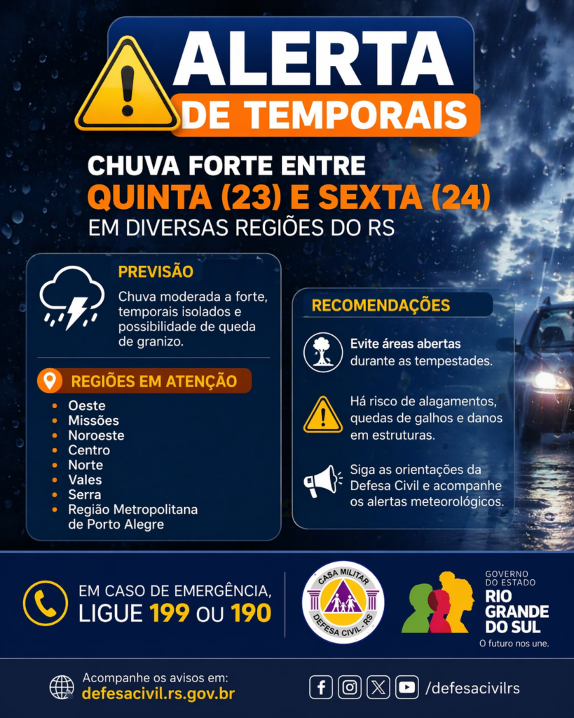 A Defesa Civil do Rio Grande do Sul emitiu um alerta para instabilidade climática entre quinta-feira (23) e sexta-feira (24), com previsão de chuva moderada a forte, temporais isolados e possibilidade de queda de granizo em diversas regiões do estado.