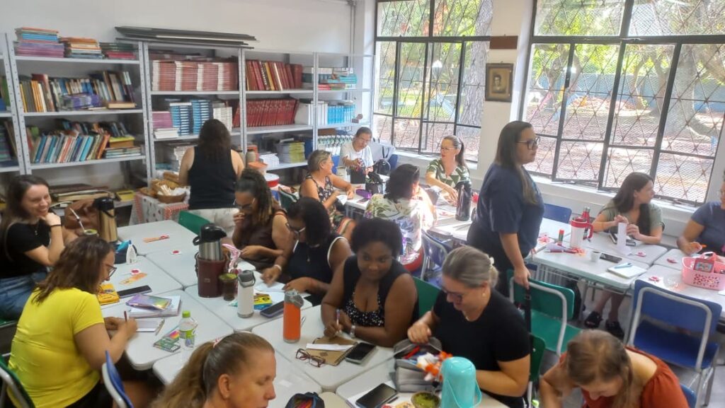 “Esse tipo de formação ajuda na nossa forma de trabalhar”, relata a professora de educação infantil Caroline Duarte. “Agrega em tudo. Cada um tem uma experiência e atua em um contexto diferente, então essas trocas são muito importantes.”